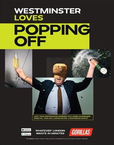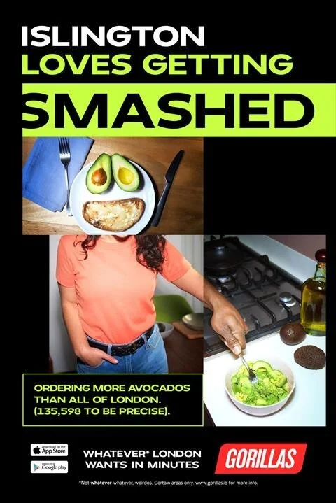 In a 30-second ad, a voiceover says “London loves acid, pints, poppers…”. The acid = lemons, the pints = of ice cream, and the poppers = champagne. Playing on words, and being a bit shocking, is a good technique for grabbing attention, and Gorillas do it well.