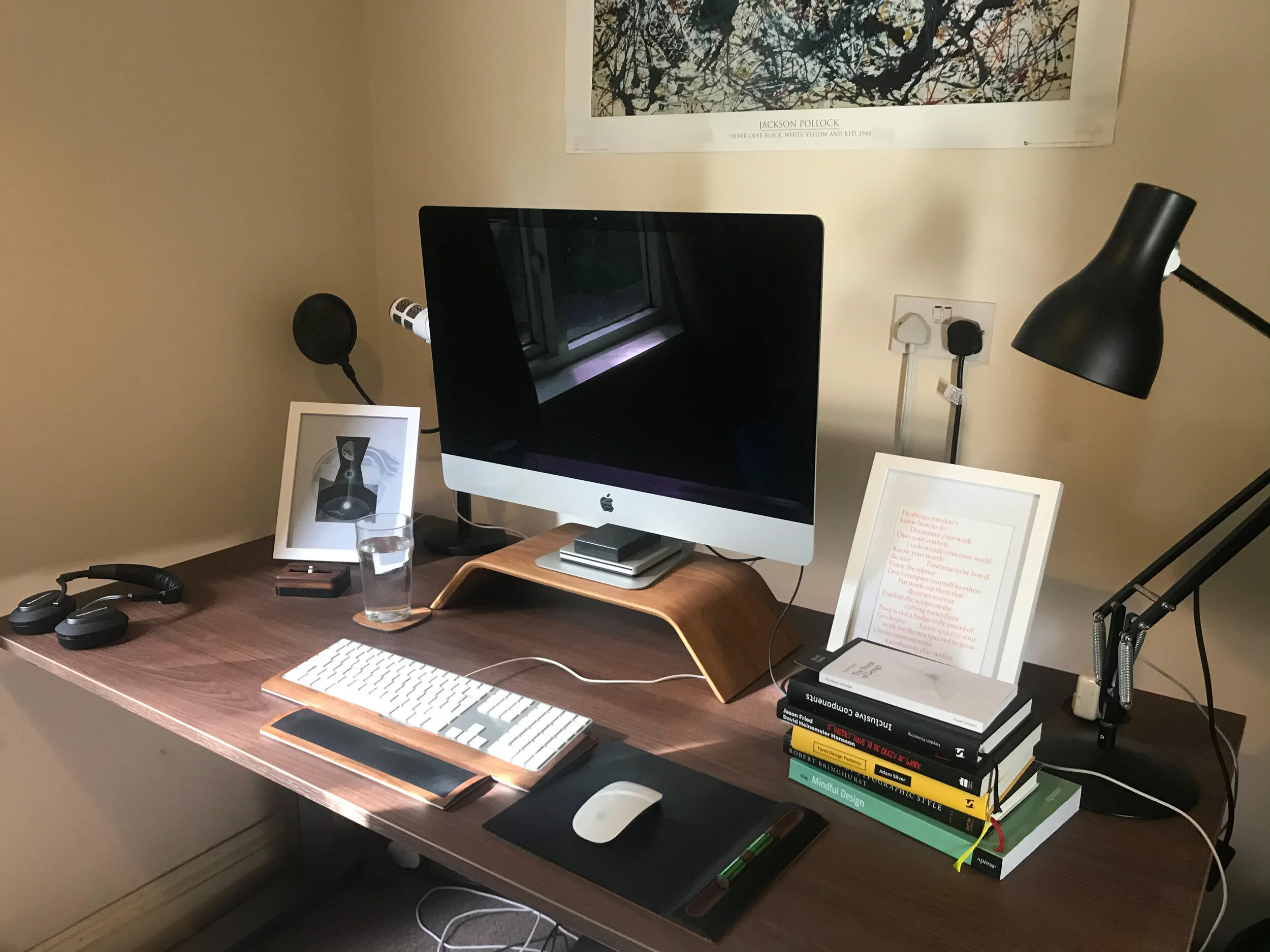 Over the years, I’ve pieced the office together. I started with an iMac and some Grovemade stands/accessories. Those are pricey, but they’ve been great for getting my monitor to the right height and make the desk look really nice.