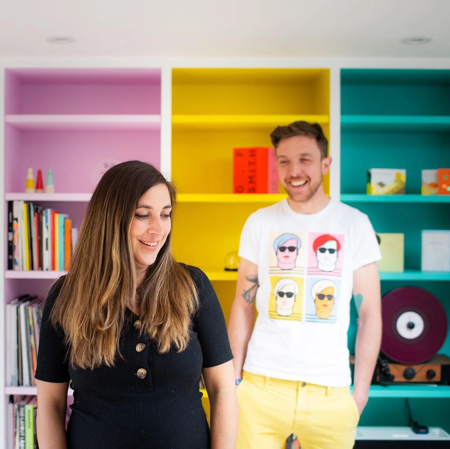 I have a garden office which Hadrien and I share, it’s a little wooden cladded building in our back garden. We have a big wooden table we work from so we can both look out into the garden and it has a big skylight. I think it’s so nice to be able to break from the laptop to look at nature, we are very lucky. We mainly get complimented on our brightly covered office shelves which are in our brand colours.